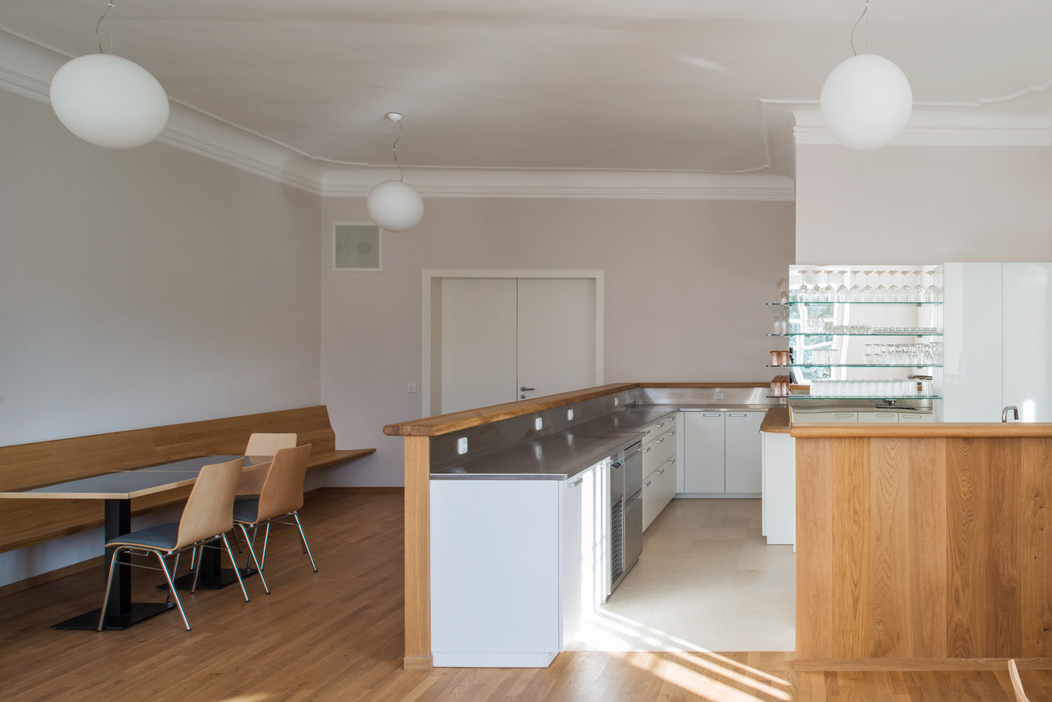 In order to expand the nave, the western wall was removed and the church interior extended by seven metres in westward direction. In place of the original rear wall two columns were installed in order to support the gallery, which was transformed into a bridge that is accessible from both sides. The free-standing gallery acts as an element that at the same time separates and connects the old and the new: Standing inside the annexe, the observer is able to look into the historic church as if looking through binoculars. Additionally, the formerly hidden wooden pipes at the back of the historic organ on the gallery have become visible for the first time.