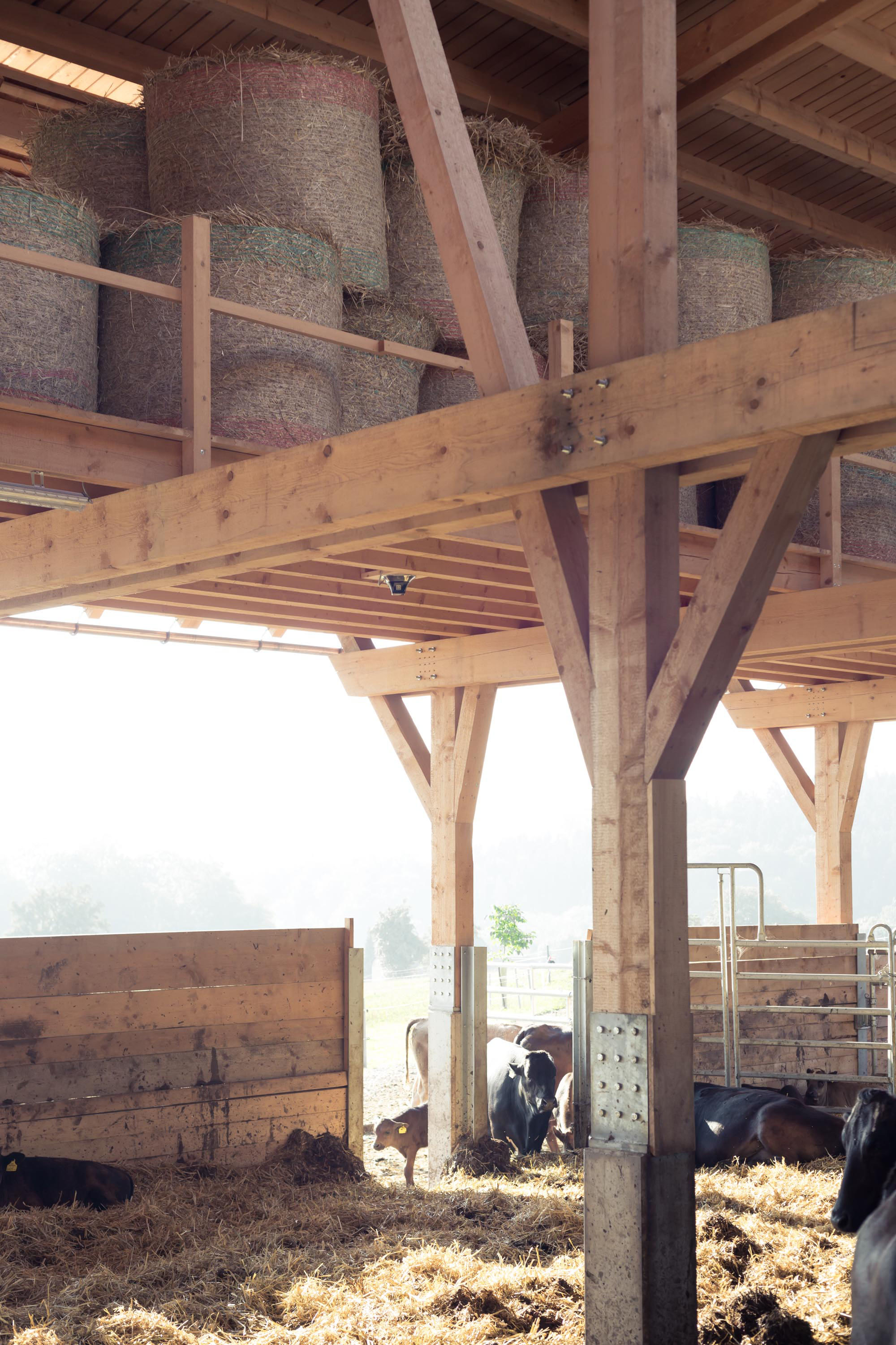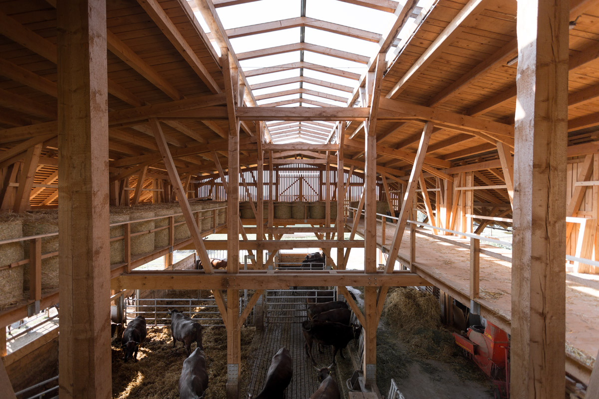 It was the aim of the construction of the exceptional cattle house to optimise the use of timber by harvesting the trees through personal selection in the forest, by the cutting of the logs in the sawmill and by the construction on site. The processed wood in the cattle house comes from spruce and fir logged in the Hausruck forest. It was cut without the pith and consists of log dimensions of 16/36 with lengths of up to 9 metres. Exhausting and passing the limits which are predetermined by the industry played an important role in sizing the wooden logs. The cattle house presents virtually the antithesis of contemporary timber manufacturing processes where the material is first cut into small pieces in order to be transformed into a substance which can be dimensioned infinitely by using a binding agent. Contrary to this technique the quality of execution of the Wagyu cattle house maxes out the knowledge of the material as such as well as traditional Upper Austrian carpentry skills without losing touch with the limits of timber.