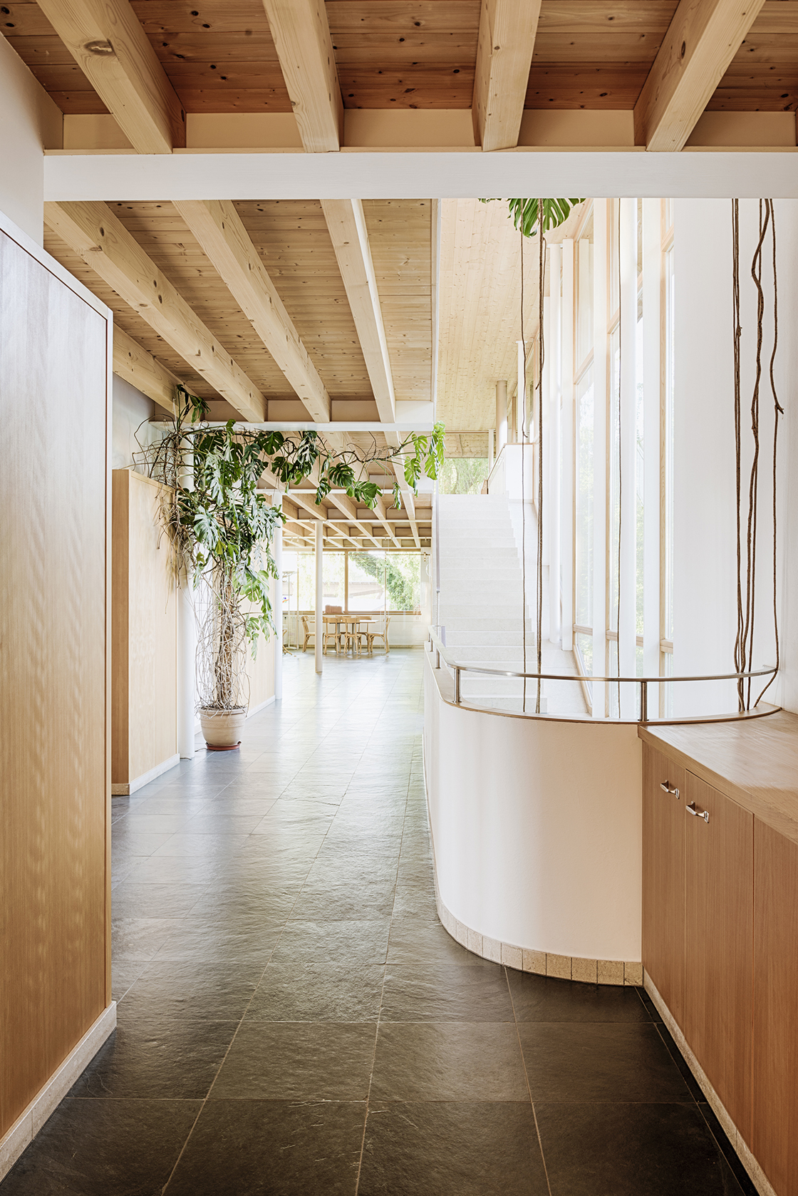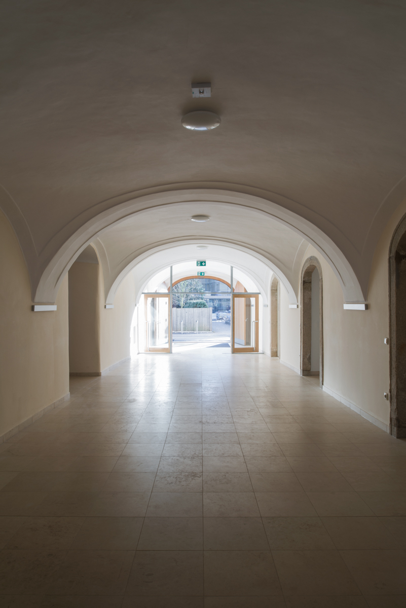 The conversion of the building was not only challenging in respect to the preservation order and a sensitive adaption of a four-hundred year old building substance to contemporary requirements of accommodation, static limits were maxed out as well. By using pre-built ribbed concrete ceilings it was possible not to exceed the weight of its previous ceilings. At the same time the building has gained a uniform and artistic element similar to a woven carpet on all its storeys.