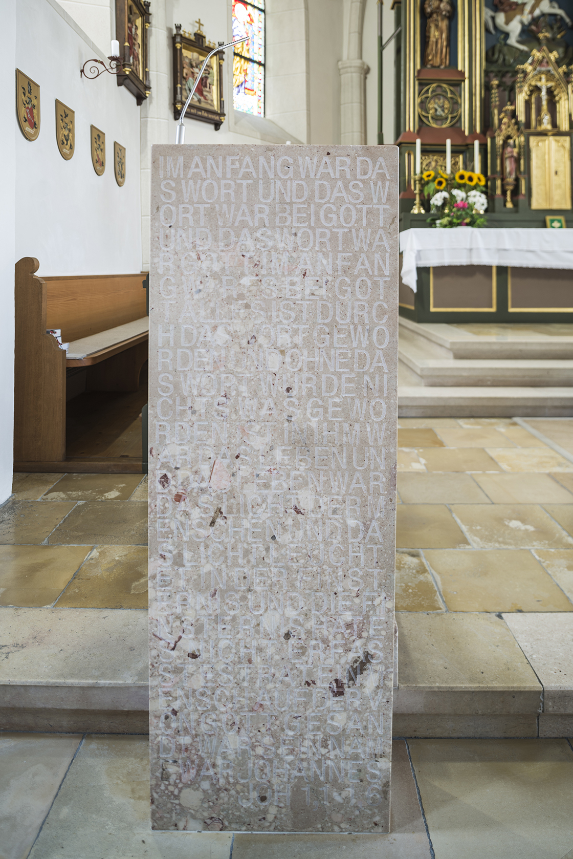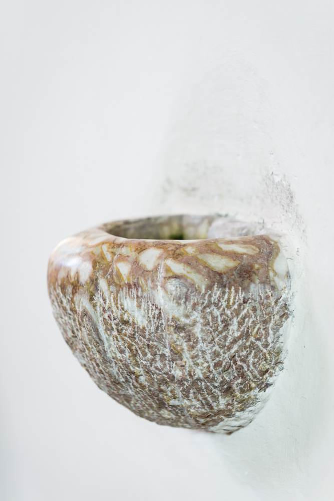 The holy water font made of Adneter dripstone was designed and completed by Herbert Schrattenecker for the conversion of the church of Kirchheim i. Innkreis.
