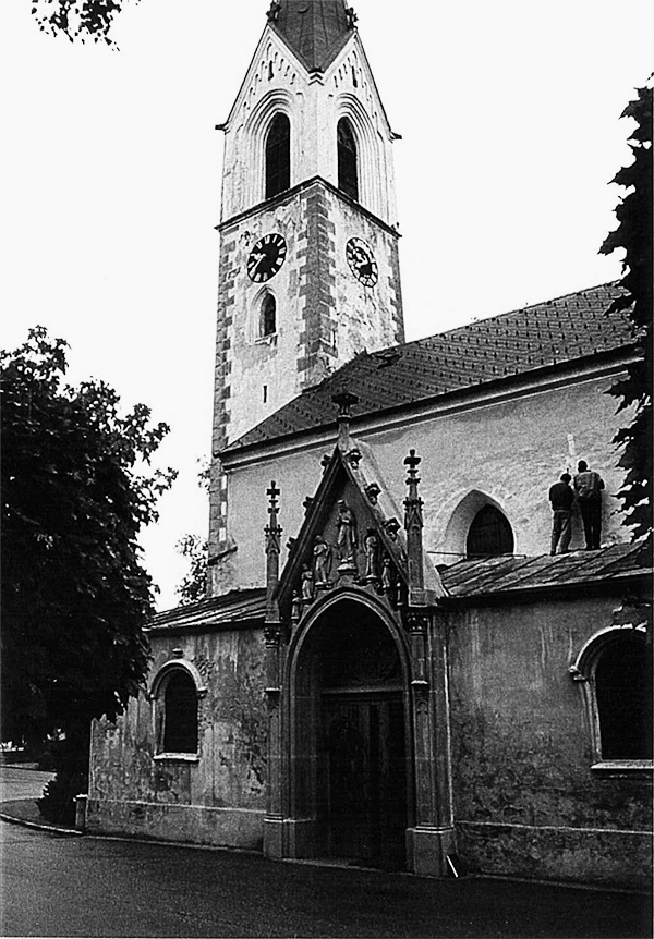 Expansion at the west side of the church, conglomerate-stone wall, southern entrance with porch roof Expansion at the west side of the church, conglomerate-stone wall, southern entrance with porch roof Southern entrance with bench Southern entrance with bench Before the adaptation with the gallery at the west wall of the nave Before the adaptation with the gallery at the west wall of the nave Gallery with extended nave and westward annex Gallery with extended nave and westward annex West view of the semi-detached gallery and organ West view of the semi-detached gallery and organ Lady chapel and newly roofed sacristy entrance Lady chapel and newly roofed sacristy entrance Restored sanctuary, new people Restored sanctuary, new people's altar and ambo Confessional room Confessional room New staircase leading to the gallery New staircase leading to the gallery Funeral hall with attached anteroom Funeral hall with attached anteroom New north wall of the funeral hall New north wall of the funeral hall