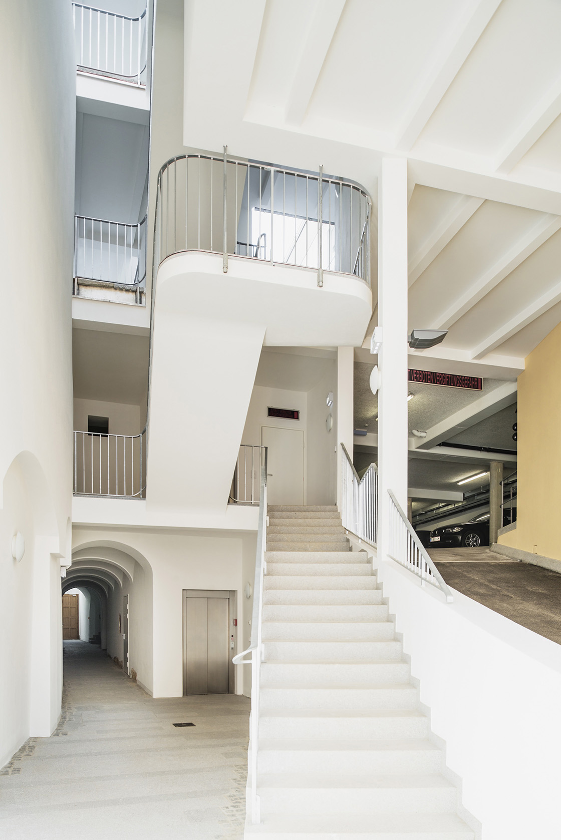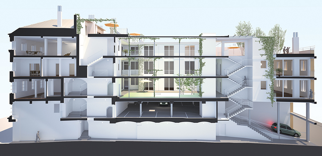 Façade facing the Kirchengasse, passageway, driveway to parking deck © Renate Schrattenecker-Fischer Façade facing the Kirchengasse, passageway, driveway to parking deck © Renate Schrattenecker-Fischer Before the conversion: façade facing the Kirchengasse Before the conversion: façade facing the Kirchengasse Heritage protected passageway with new staircase © Renate Schrattenecker-Fischer Heritage protected passageway with new staircase © Renate Schrattenecker-Fischer Courtyard above the parking deck, view to the south © Renate Schrattenecker-Fischer Courtyard above the parking deck, view to the south © Renate Schrattenecker-Fischer Courtyard on the second floor, view to the north © Renate Schrattenecker-Fischer Courtyard on the second floor, view to the north © Renate Schrattenecker-Fischer New and roofed staircase opening towards the access balconies © Renate Schrattenecker-Fischer New and roofed staircase opening towards the access balconies © Renate Schrattenecker-Fischer Heritage protected staircase, newly created vista into passageway © Renate Schrattenecker-Fischer Heritage protected staircase, newly created vista into passageway © Renate Schrattenecker-Fischer Maisonette with ribbed slab ceiling © Renate Schrattenecker-Fischer Maisonette with ribbed slab ceiling © Renate Schrattenecker-Fischer Set of rooms, flat facing the courtyard © Renate Schrattenecker-Fischer Set of rooms, flat facing the courtyard © Renate Schrattenecker-Fischer Flat with a loggia on one side, window shutters facing south © Renate Schrattenecker-Fischer Flat with a loggia on one side, window shutters facing south © Renate Schrattenecker-Fischer Adapted passageway, opening of historical staircase on upper floor © Renate Schrattenecker-Fischer Adapted passageway, opening of historical staircase on upper floor © Renate Schrattenecker-Fischer Section through the designed perspective of both houses, garage and courtyard Section through the designed perspective of both houses, garage and courtyard