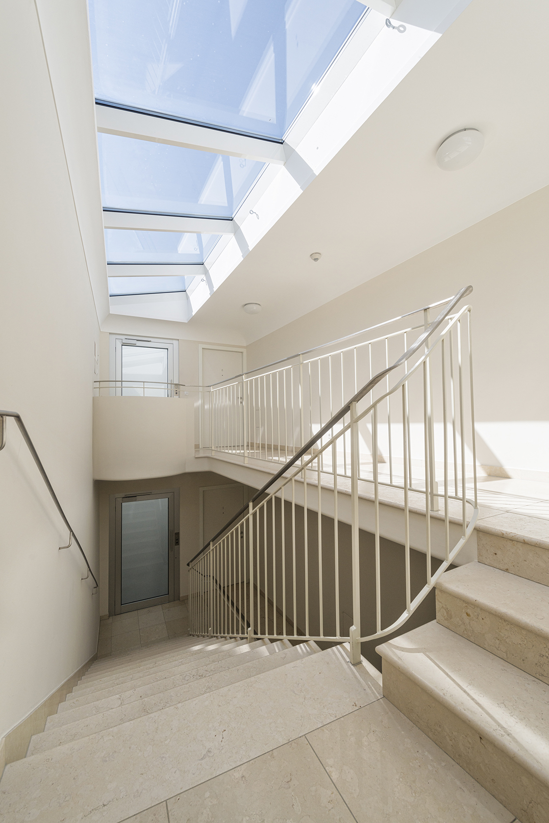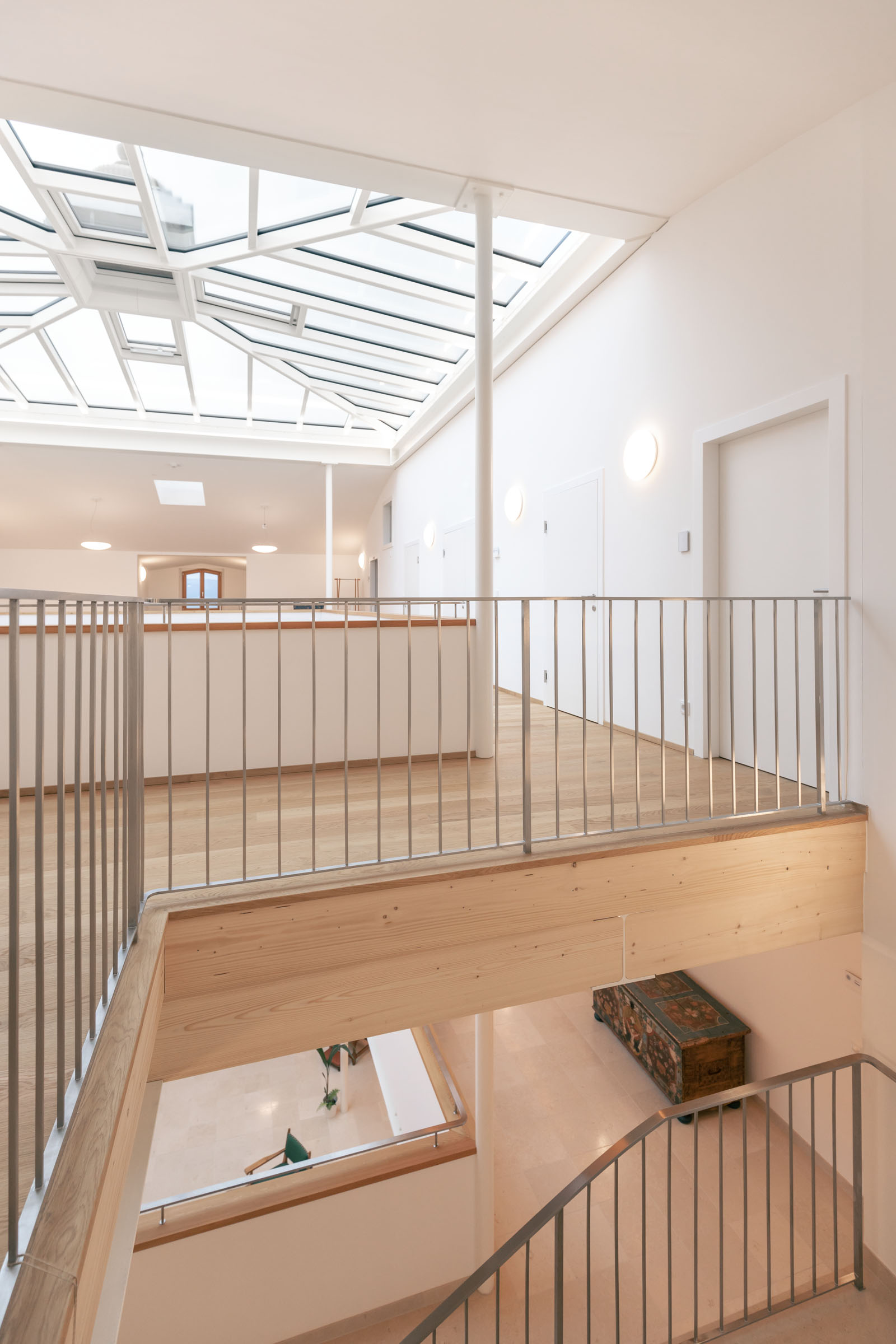 It was the builder-owner´s ambition to create attractive living space and to revitalise the historic town centre. This idea was followed by a design that focused on dismantling uncompromisingly the dense structure of the building and on restoring the central court with circumjacent arcades. All of the twelve apartments of 60 to 180m2 feature a loggia, a terrace or a small private garden. From one of the original passages of the building two stairs, one of them under monumental protection, and a lift take you to the upper floors of the edifice. The garage on the first floor is accessible via a driveway from Kirchengasse. Since Ried was founded on marshland, an underground carpark was difficult to realise. Five apartments are arranged around the courtyard which is located above the garage – a pattern continued on the third floor. Three maisonettes, with generous private terraces, are set back on the upper floor and provide in this way sufficient lighting for the courtyard.