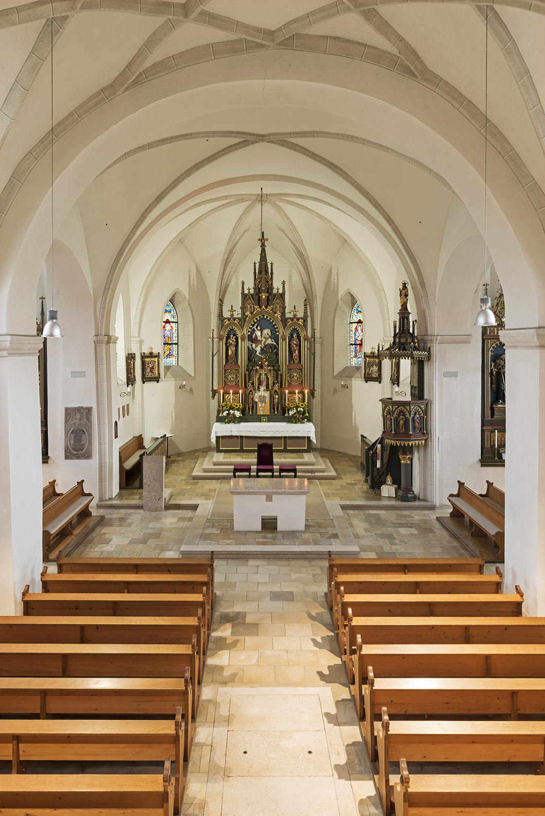 The historic church building consists of a nave bordering the gallery on the western wall, as well as a southern aisle – an element typical of this region. Its aim was the adaptation of the parish church was its visible preservation with specific consideration of existing Gothic proportions.