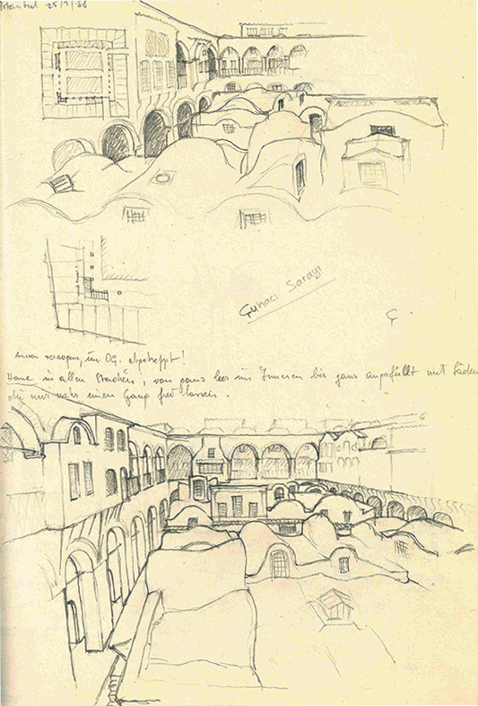 Roofscape in Split, watercolour on paper Roofscape in Split, watercolour on paper Cuhaci Han, Istanbul, pencil drawing Cuhaci Han, Istanbul, pencil drawing Sketch based on a textile printing, watercolour on paper, Topkapi Serail, Istanbul Sketch based on a textile printing, watercolour on paper, Topkapi Serail, Istanbul Turkish house in Antalya, pencil drawing Turkish house in Antalya, pencil drawing