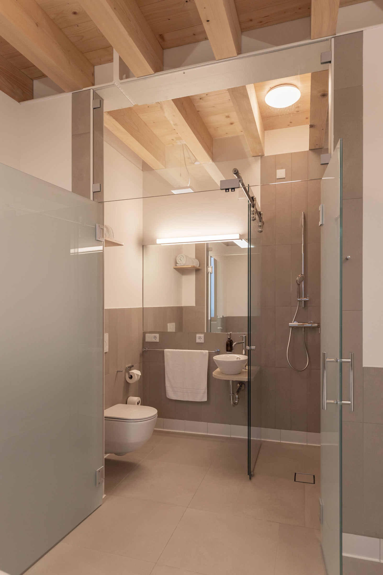 The most striking feature of the cattle house is its roof. It is stepped on two levels in order to provide adequate ventilation for the roof framework  - on the one hand above the lateral roof wings and on the other hand underneath the gable. The lateral stepped roof area was covered with larch shingles through personal contribution by the family Huemer. Above it lies the tin roof which is set back. The gable is formed by a glass triangle that is permeable to light which provides daylight for the building along its whole length.