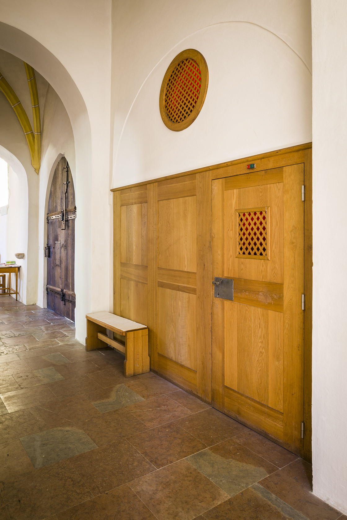 Walls and vaults within the annexe were built and plastered by local craftsmen using traditional methods. At this, the western exterior wall was provided with a primary wall of conglomerate rock for weather protection. Arched windows were designed for the annexe as a means of linking the building’s old Gothic elements with the rounded shapes of the new building section. Artistically they continue the tradition of the Barock windows of the baptistery located in the east of the building.  In its outer appearance the church extension depicts another stage in the history of the building meeting the requirements of its grown community.